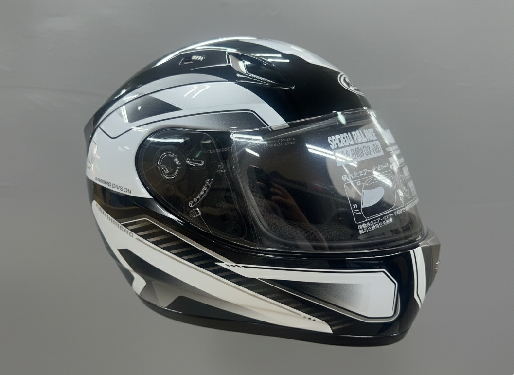 こちらはバイクを運転する際に、頭を守る為に装着するフルフェイスオートバイ用ヘルメットになります。頭全体を覆い、顔面も守る防御性が高いヘルメットの形状で安全性に配慮されているので、高速走行や長距離の走行において信頼性が高いとされてます。